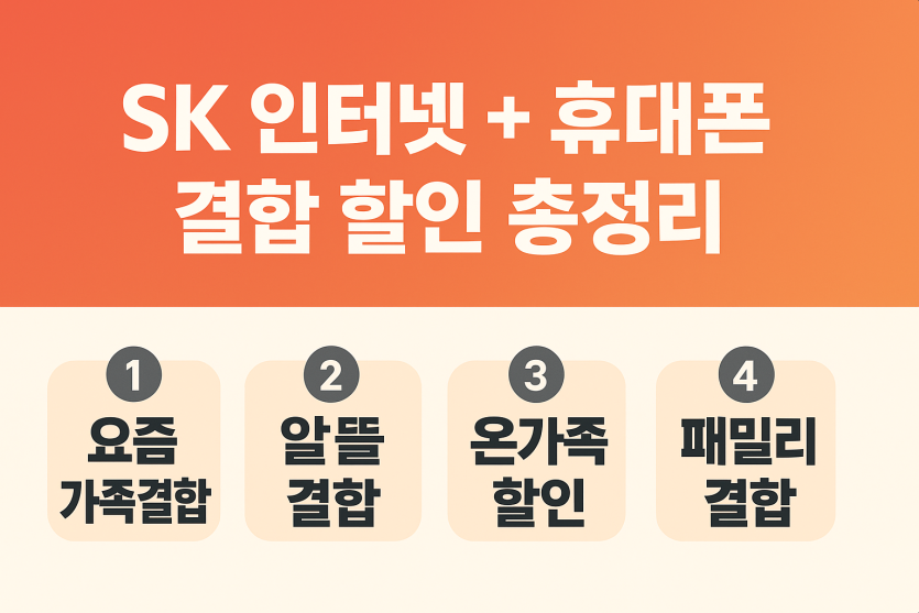 SKT/SK브로드밴드는 인터넷과 휴대폰을 함께 쓰면 매달 통신비를 낮출 수 있는 결합 할인을 제공합니다. 핵심 4가지(요즘가족결합, 알뜰결합, 온가족할인, 패밀리 결합)만 이해하면 우리 집에 가장 유리한 조합을 빠르게 고를 수 있어요. 아래에서 포인트만 꽉 눌러 담았어요.